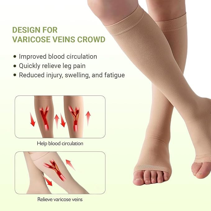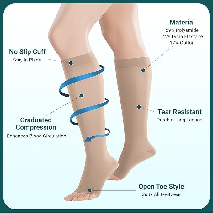 Generic - زوج من جوارب طبية كلاسيكية الضاغطة لدعم الدوالي، وتحسين الدورة الدموية في الساق وتخفيف الألم، من الفئة 2، مفتوحة الأصابع، مثالية للرجال والنساء، أسفل الركبة، ضغط 23-32 ملم