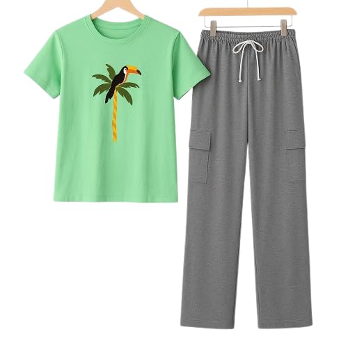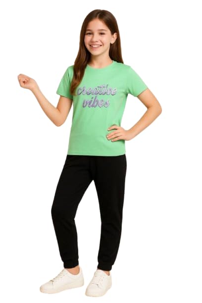 Generic - بيجامه بناتي -تيشرت و بنطالون - خامه قطن سينجل ليكرا 100% - طباعه ضد التشقق و التقشير - لون أخضر - مقاس 12 - موديل رقم #: 524-0802