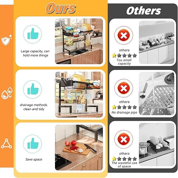 - 【تنظيم كامل فوق الحوض】: مطبقية مطبخ فوق الحوض 2 دور لتجفيف الأطباق والأكواب مباشرة فوق الحوض، تعمل كـ رف تجفيف الأطباق ومنظم الأطباق في نفس الوقت وتوفر مساحة كبيرة على رخامة المطبخ.