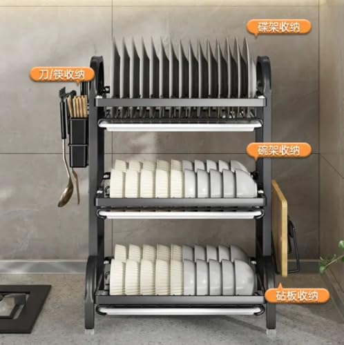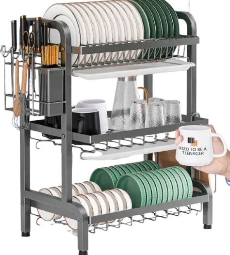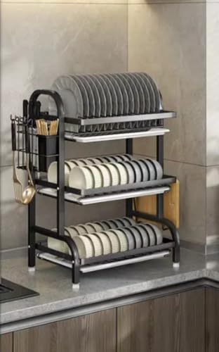 Generic - منشر أطباق معدني فضي لأواني المطبخ، بتصميم ثلاثي الطبقات مع حامل للأدوات وطلاء مقاوم للصدأ، 3 طبقات
