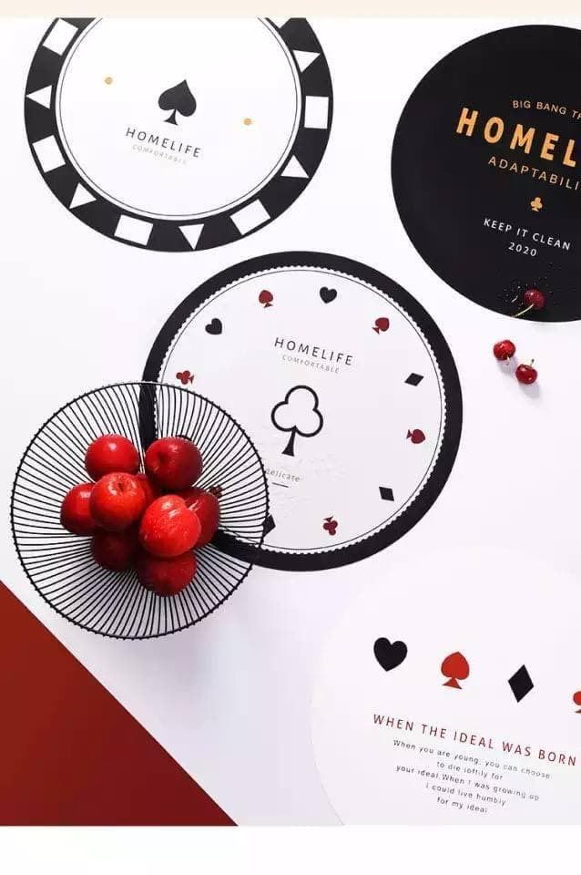 - تصميم مميز: كوستر دائري بأشكال ورموز كروت اللعب الأنيقة بالألوان الأسود والأبيض والأحمر، يضيف لمسة عصرية وجذابة لطاولتك