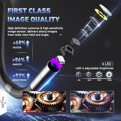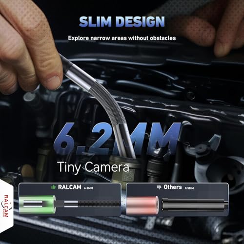 Ralcam - كاميرا فحص مرنة بويورب سكيب رالكام 360 درجة مع ذراع توجيه الجويستيك 6.2 ملم، رأس IP67 مقاوم للماء، كاميرا فحص السيارات بويورسكيب بأربع طرق مع 6 مصابيح LED قابلة للتعديل وأنبوب شبه صلب 3.3 قدم