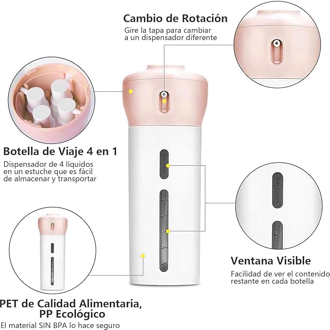 - ✨【تصميم مريح】: يحتوي موزع السفر الخاص بنا على 4 زجاجات سفر قابلة لإعادة الملء تتناسب مع علبة التوزيع. يمكنها حمل مستلزمات التجميل بسهولة مثل جل الاستحمام والشامبو والبلسم وما إلى ذلك.
