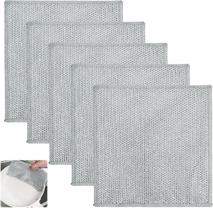 Generic - منشفة تنظيف مصنوعة من القماش والسلك الميش، فضية اللون، عبوة من 5 قطع، سريعة الجفاف ومتينة للاستخدام المتعدد في تنظيف الأطباق
