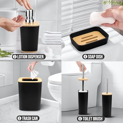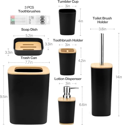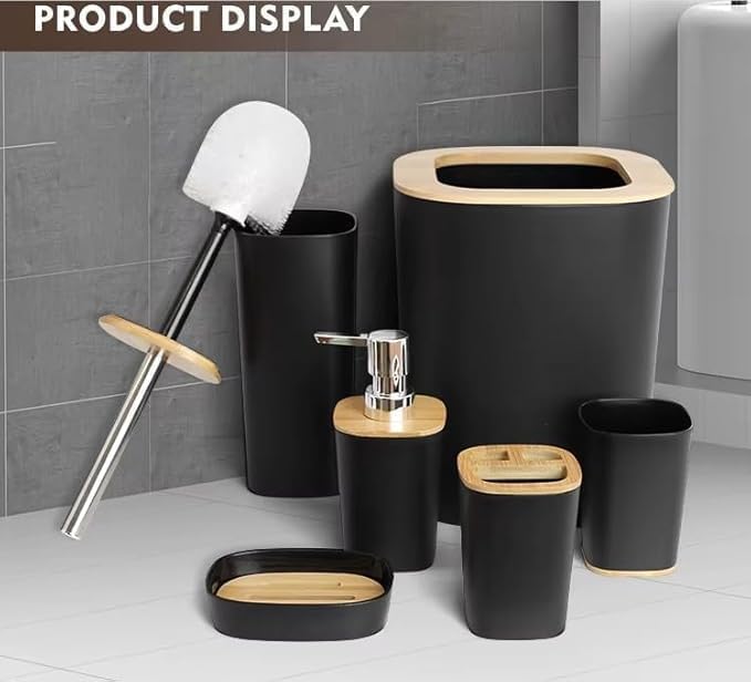 - مجموعة كاملة من 6 قطع: تتضمن موزع لوشن وكوب وحامل فرشاة أسنان وطبق صابون وحامل فرشاة مرحاض وسلة نفايات.