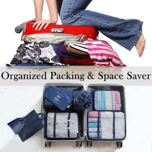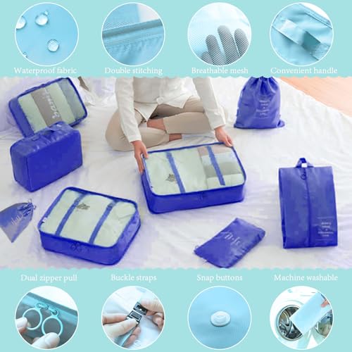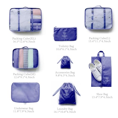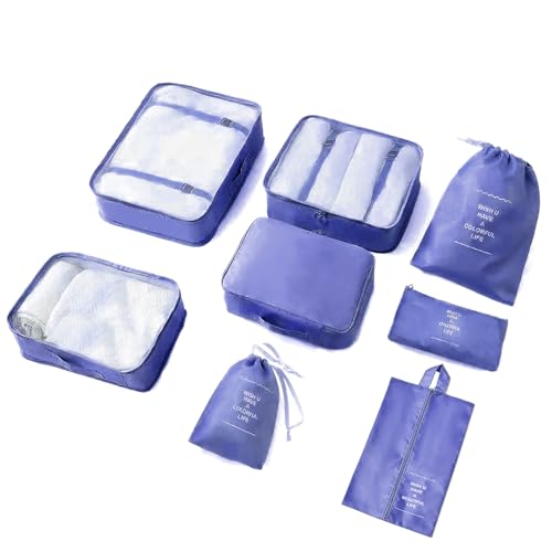 LOVCY - مجموعة شنط تخزين شبكية من لوفسي مكونة من 8 قطع مناسبة للسفر، مجموعة شنط تنظيم الأمتعة ومستلزمات السفر مع شنطة غسيل، شنطة تخزين الأحذية، شنطة ملابس داخلية (لون أزرق نيلي)