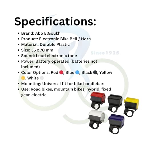 MOHAMED ABO ELGOUKH - زمارة إلكترونية عالية للدراجات الجبلية والطرق جرس بلاستيك من أبو الجوخ، حجم صغير 35 ملم × 70 ملم، 5 خيارات للألوان أحمر، أزرق، أسود، أصفر، أبيض