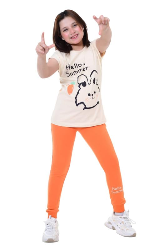 AKEEYO - بيجامة صيفية للبنات بطباعة أرنب، لون كريمي*برتقالي- G-PJ-HS-BEIORG-P من ايه كيه واي