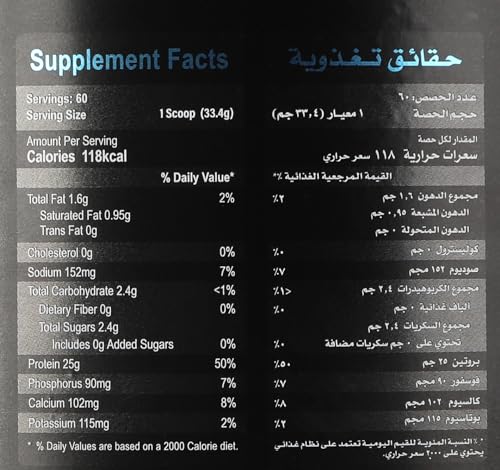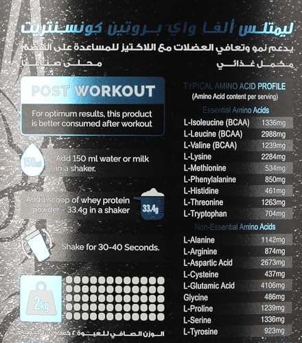 - يحتوي على 25 جم من بروتين بناء العضلات و5.5 جم من الأحماض الأمينية الطبيعية المشبعة و4 جم من الجلوتامين.