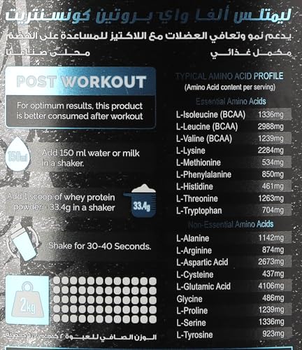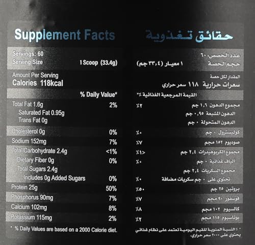 - يحتوي على 25 جم من بروتين بناء العضلات و5.5 جم من الأحماض الأمينية الطبيعية المشبعة و4 جم من الجلوتامين.