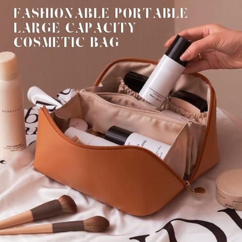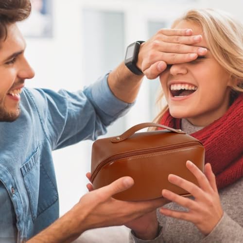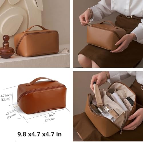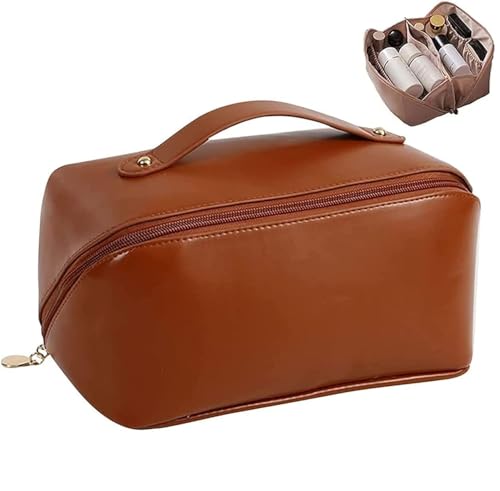 AMERTEER - اماتير شنطة مستحضرات تجميل للسفر بسعة كبيرة مكياج متعددة الوظائف من جلد البولي يوريثين مع مقبض ومقسم شنط للنساء لون بني ادوات الزينة اميرتير