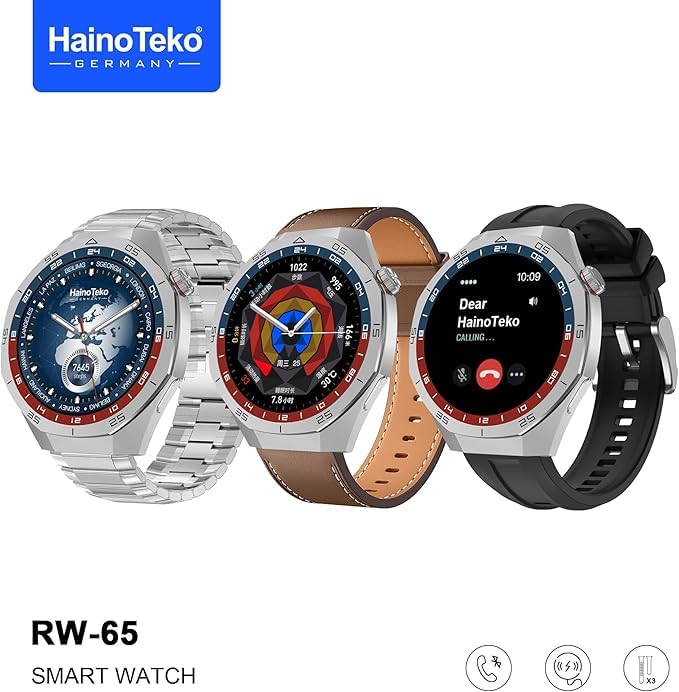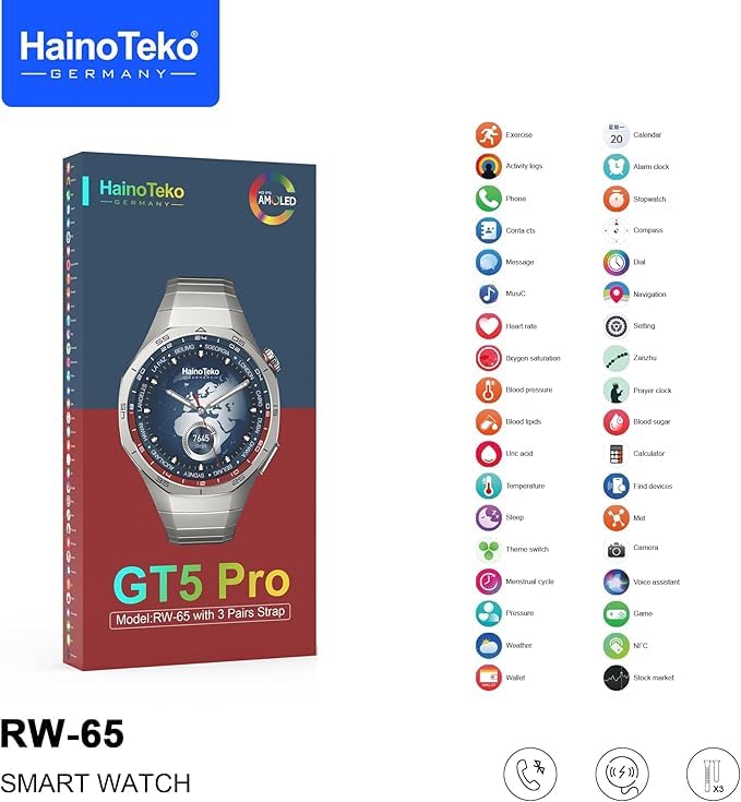 Generic - ساعة ذكية بشاشة AMOLED عالية الدقة - شاحن لاسلكي مغناطيسي - تدعم الاشعارات والاوضاع الرياضية المختلفة - 3 استراب - هاينو تيكو GT5 برو RW-65