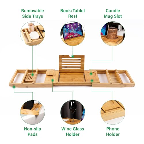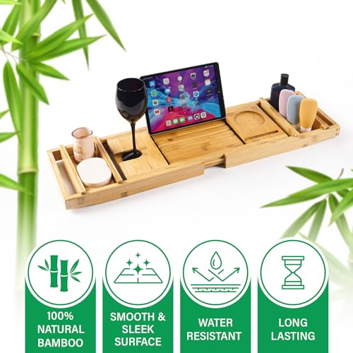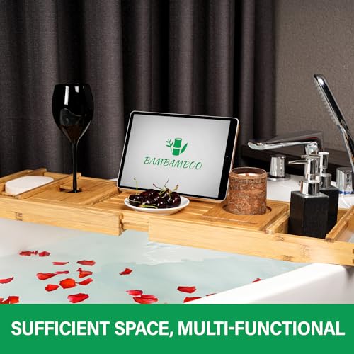 BamBamBoo - صينية حوض استحمام فاخرة، صينية حوض استحمام من الخيزران قابلة للتوسيع مع جوانب ممتدة، حامل هاتف زجاجي بلون بني، حامل كتب للحمام والمنتجعات الصحية الفاخرة، طبق صابون مجاني