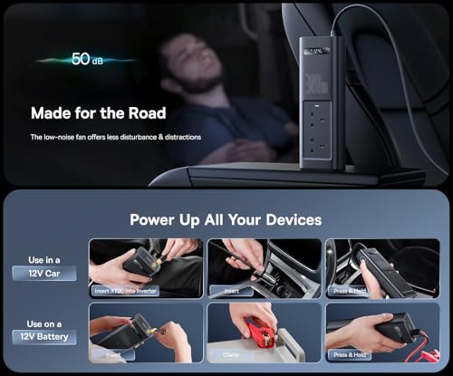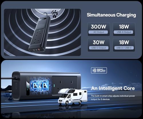- 2️⃣ مخرج طاقة 300 واط - يحول تيار مستمر 12 فولت إلى تيار متردد 200 فولت - 240 فولت مع تقنية الموجات الجيبية النقية للحصول على طاقة آمنة ومستقرة.