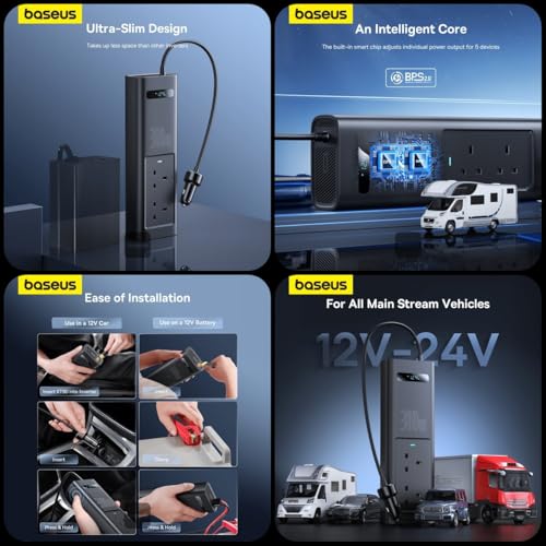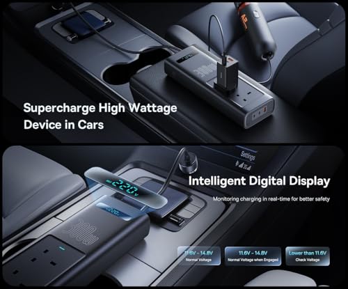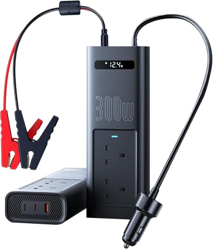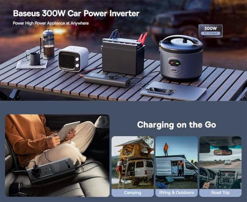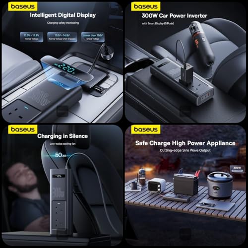 Baseus - عاكس كهربائي وشاحن سيارة 300 وات بشاشة ذكية و5 منافذ (2 منفذ تيار متردد، 2 USB-C، 1 USB-A)، تيار مستمر 12 فولت إلى 200-240 فولت تيار متردد من باسيوس، محول شحن سريع للتخييم والرحلات البرية والسفر في
