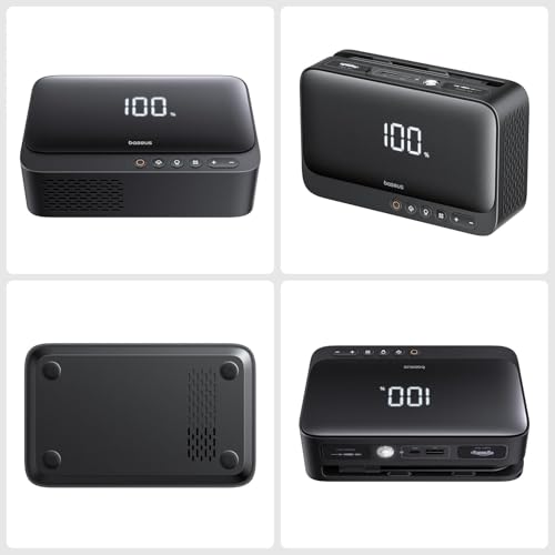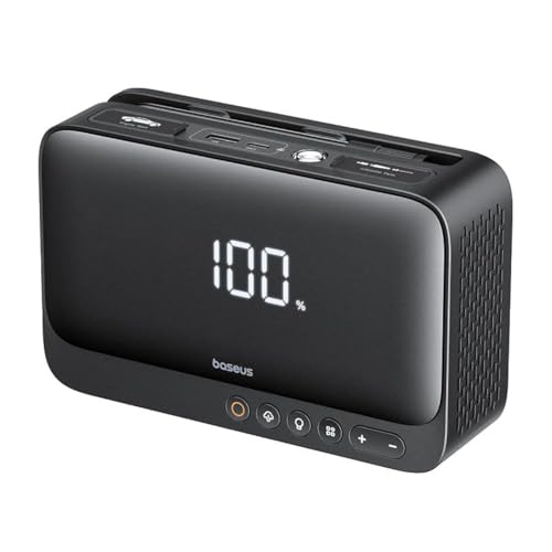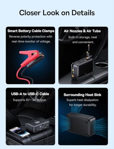 - ✅ 4 في 1: باور بانك + مشغل قفز للسيارة + ضاغط هواء نافخ + ضوء فلاش