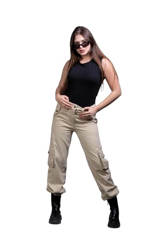 Basic Wear Club - بنطلون كارجو للنساء من بيسيك وير كلوب، بيج/اخضر زيتوني، S/M/L، خصر مرتفع، ساق واسعة، جبردين، قصة مريحة، جيوب كارجو متعددة