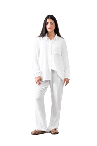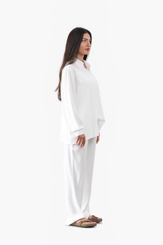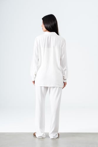 Basic Wear Club - طقم ملابس نوم من الكتان للنساء من بيسيك وير كلوب، بلوزة ملفوفة باكمام طويلة مع بنطلون بارجل واسعة، بيج/اوف وايت/اسود/كحلي، كتان اسباني، مريح كاجوال
