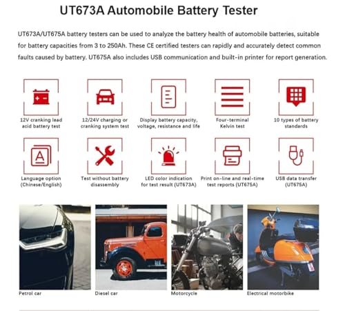 - جهاز اختبار: جهاز UT673A لفحص البطارية مزود بشاشة LCD رقمية واضحة لعرض النتائج بدقة