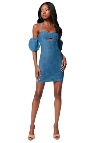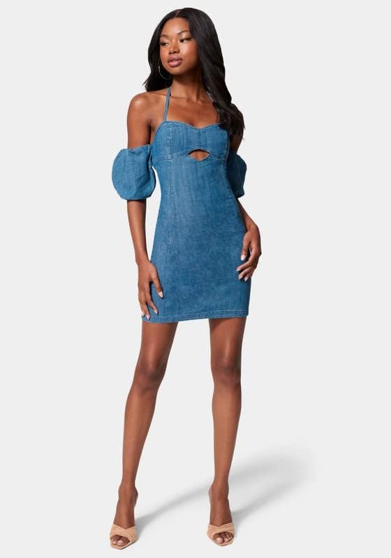 bebe - بيبي فستان جينز مكشوف الكتفين باكمام منفوخة 0 ازرق دينيم، XS، للنساء