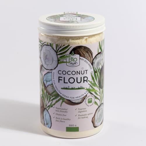 Biohayah - دقيق جوز الهند العضوي - بديل دقيق خال من الغلوتين للكيتو والباليو والخبز النباتي، قليل الدسم - غير معدل وراثيا، غير مكرر 550 جرام