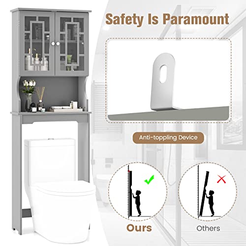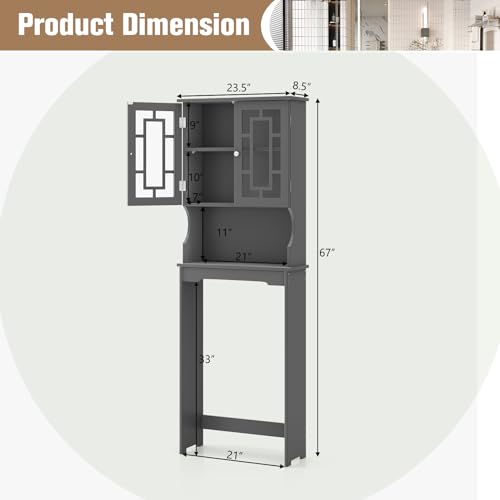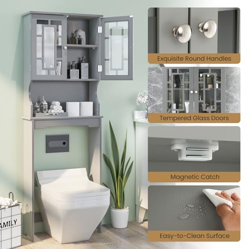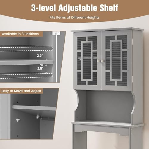 - 【تخزين فوق المرحاض】خزانة الحمام مع بابين زجاجيين لتخزين ورق المرحاض والمناشف والشامبو. ويمكنك تخصيص مساحة التخزين على 3 ارتفاعات مختلفة (6.35 سم لكل مستوى) مع الرف القابل للتعديل. بينما يوجد رف مفتوح إضافي في الأسفل لسهولة الوصول أو العرض.