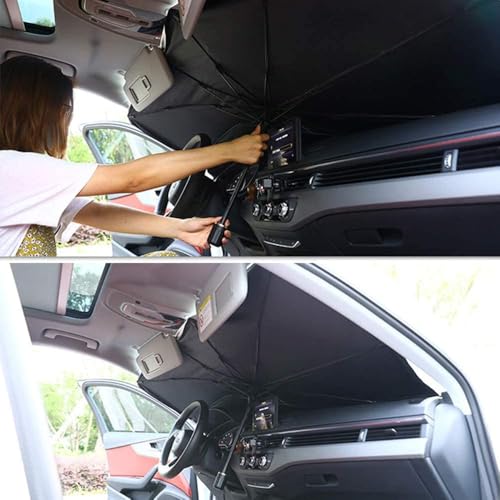 - 【الحماية من الشمس】الشماسة بشكل شمسية مصنوعة من مواد عالية الجودة، وهي لا تعكس أضواء الشمس بشكل مثالي فحسب بل تحمي أيضًا التابلوه وصالون السيارة من البهتان والتشققات بالإضافة إلى تقليل الوقت اللازم لتبريد سيارتك.