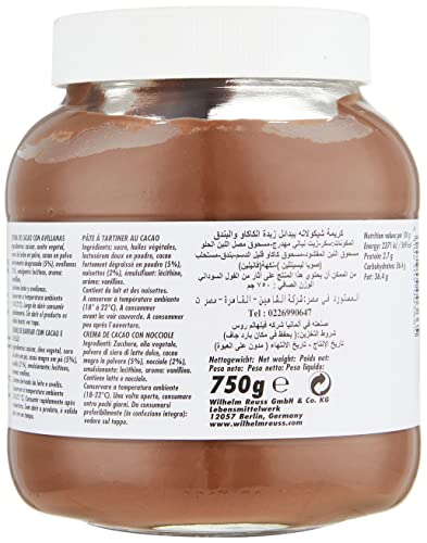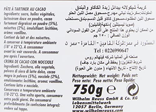 - المكونات: سكر، زيت بذور اللفت، زيت النخيل، مالتوديكسترين، مسحوق كاكاو قليل الدهن (5٪)، بندق (2٪)، مسحوق مصل اللبن، مستحلب، ليسيثين، النكهه