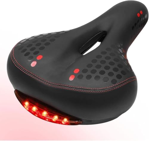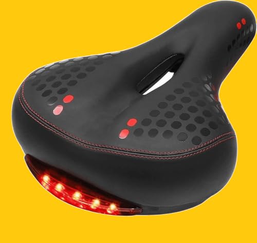 - مقعد دراجة مريح وعريض وناعم ومبطن ومقاوم للماء بملائمة عالمية من مادة ميموري مع ضوء خلفي
