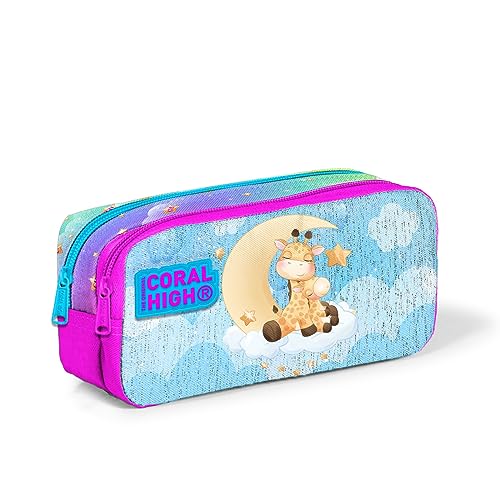 Coral High - مقلمة للأقلام الرصاص بجيبين بنمط زرافة للأطفال من كورال هاي، لون أزرق ووردي