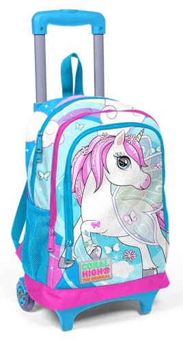 Coral High - شنطة ظهر مدرسية للأطفال بتصميم مكون من ثلاث أقسام ومزود بواقي مطاطي من كورال هاي، أزرق نيون وبينك بنمط يونيكورن