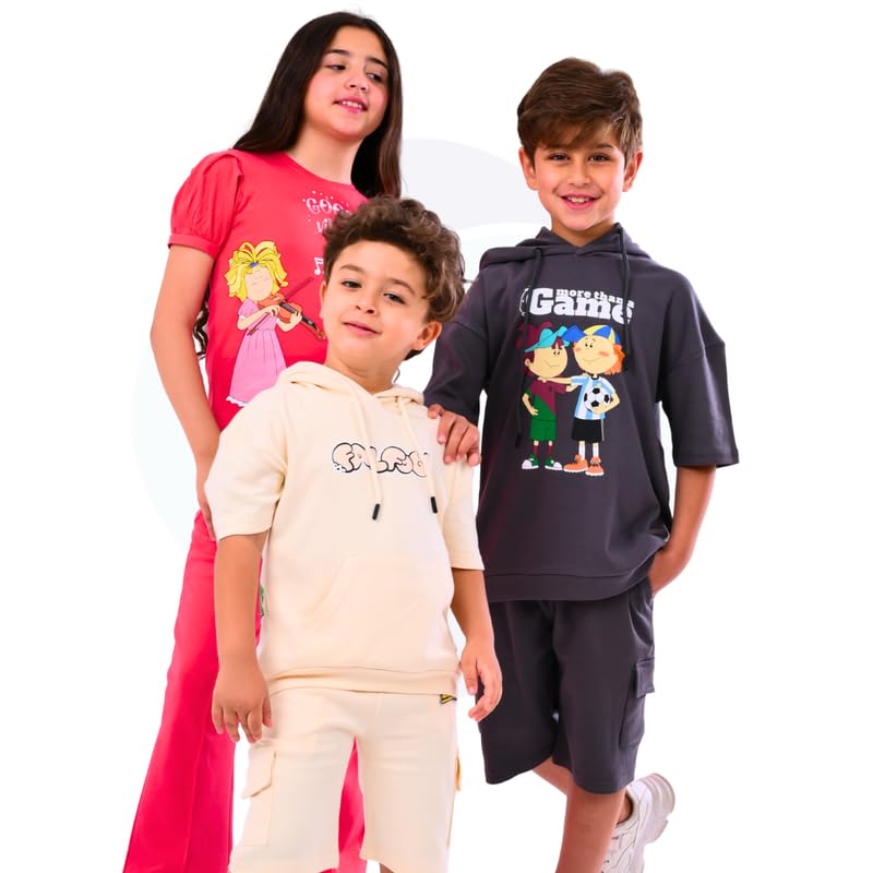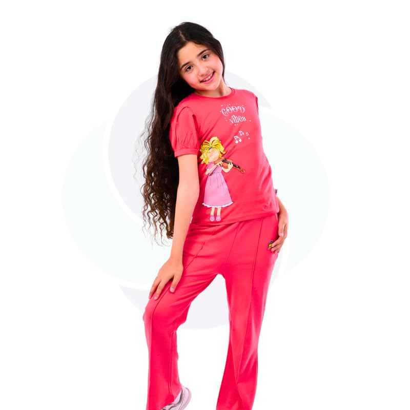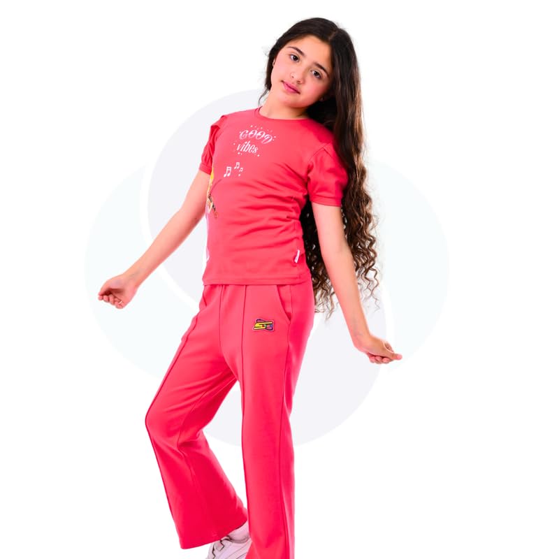 Cotton Zone - كوتون زون طقم ملابس خارجية قطن للبنات من مودا مودي - تيشرت بينك مطبوع عليه شعار مودا - بنطلون بارجل واسعة بلون بينك مقاس