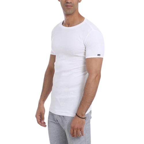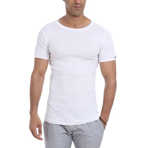 Cottonil - فانلة ديربي مضلعة برقبة دائرية ضيقة وأكمام قصيرة للرجال، قصة ضيقة سليم فت، من قطونيل، أبيض