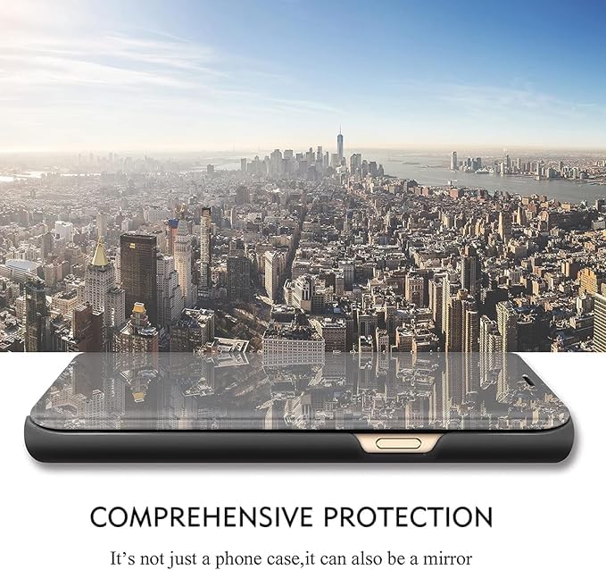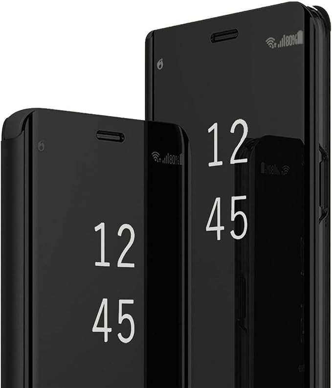 ELMO3EZZ - جراب حماية رفيع بتصميم مراية عاكس كلير فيو وقابل للطي مضاد للصدمات والخدوش مع مسند متوافق مع موبايل سامسونج جالاكسي A14، لون أسود