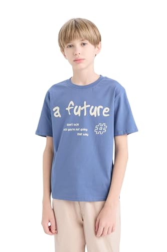 DeFacto - ديفاكتو تيشرت كاجوال محبوك باكمام قصيرة ورقبة دائرية ضيقة وقصة عادية للاولاد بعمر 8/9 سنوات لون ازرق نيلي فاتح