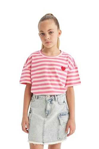 DeFacto - تيشرت منسوج طراز C4509A8 بقصة واسعة ورقبة دائرية ضيقة وأكمام قصيرة للبنات من ديفاكتو