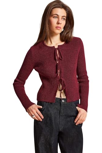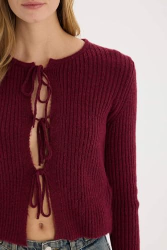 DeFacto - كارديجان صوف بيسيك سادة بقصة عادية ورقبة دائرية ضيقة برباط من الاسفل، لون بورجندي
