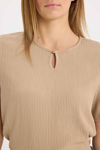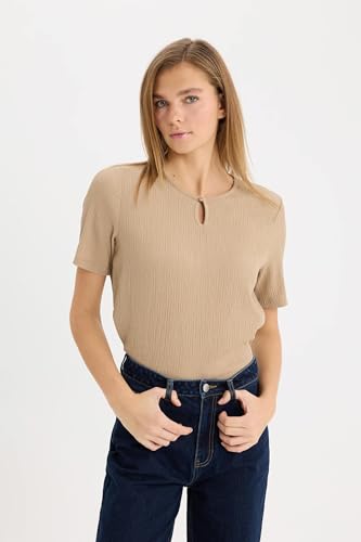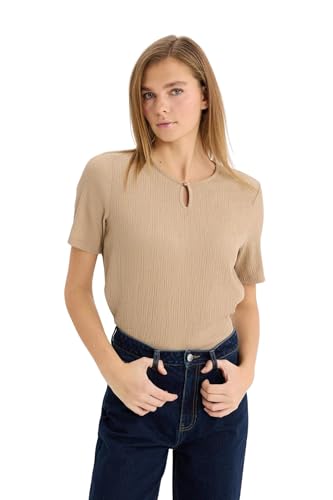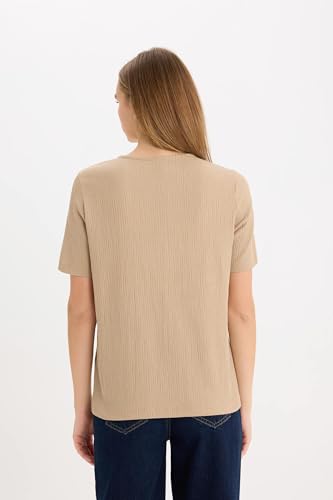 DeFacto - تيشرت للنساء بقصة عادية ورقبة مرتفعة دائرية بأكمام قصيرة من قماش منسوج بطريقة تقليدية بأكمام قصيرة من ديفاكتو، موديل D8659AX
