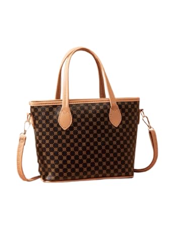 Generic - شنطة يد كبيرة توت بتصميم مربعات من ديزاينر، قماش مع حواف جلدية، مقبض مزدوج مع حزام كتف، بني وبيج، 30 × 25 سم