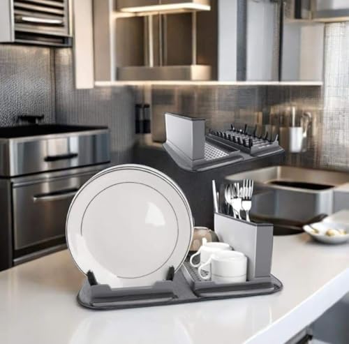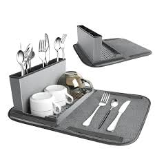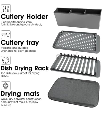 - مجموعة متعددة الاستخدامات: تتضمن مجموعة تجفيف الأطباق الخاصة بنا رف أطباق قابل للطي ومفرش مايكروفايبر وصفاية أطباق قابلة للطي ومنظم أدوات المائدة.