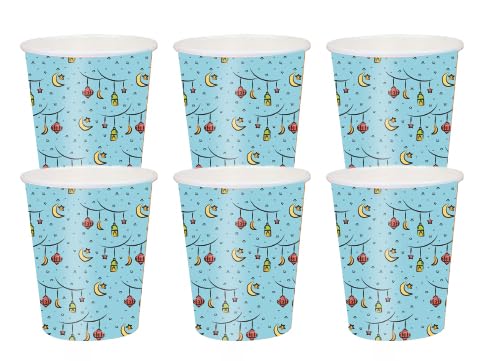 - تصميم احتفالي: أكواب ورقية بلون تركواز تتميز بنمط زينة ساحرة للعطلات مع أقمار ونجوم وحلي زخرفية مثالية للاحتفالات والحفلات الموسمية.