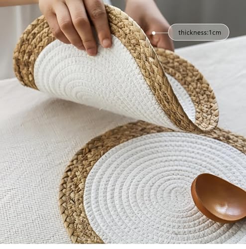 - منسوجة يدويًا من الجوت الطبيعي وحبل قطني، كل سجادة دائرية صديقة للبيئة ومتينة وتتميز بنسيج بسمك 1 سم وقطر 37.5 سم.