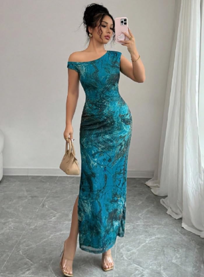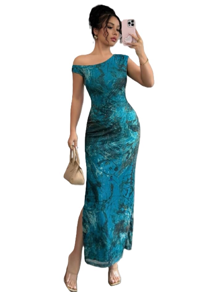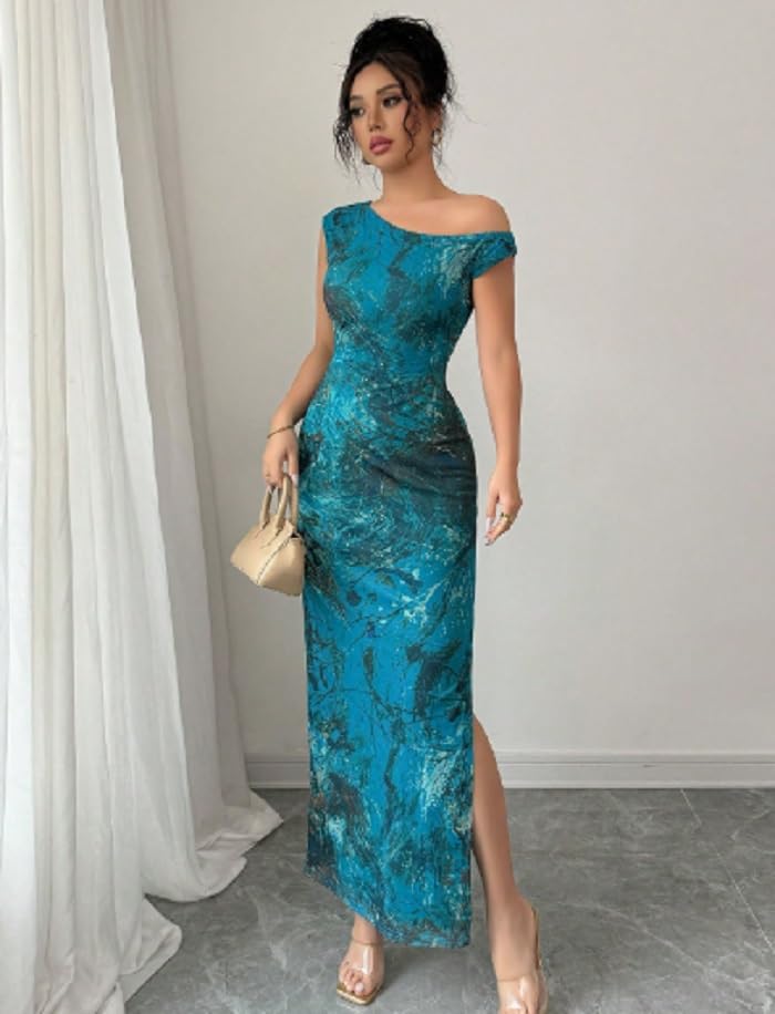 Generic - فستان ماكسي أنيق بقصة ضيقة ورقبة غير متساوية وفتحة للفخذ، أزرق