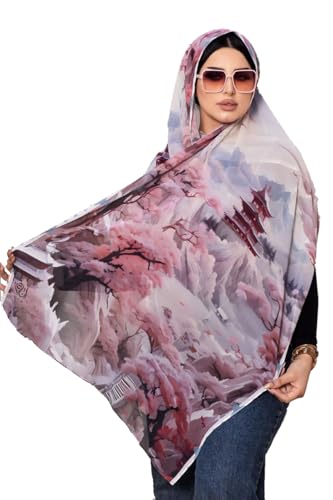 Anaqah Scarf - وشاح حجاب شيفون انيق، طباعة زهور الكرز، تصميم حديقة يابانية، بينك ورمادي