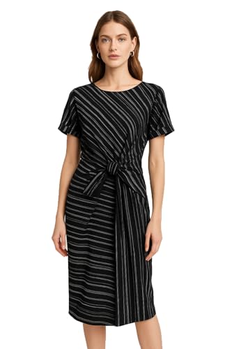 Generic - فستان انيق مخطط متوسط الطول مع خصر فيونكة - سحاب خلفي - تفاصيل فضية - ملابس كاجوال للحفلات (توماس اند سبليندور)