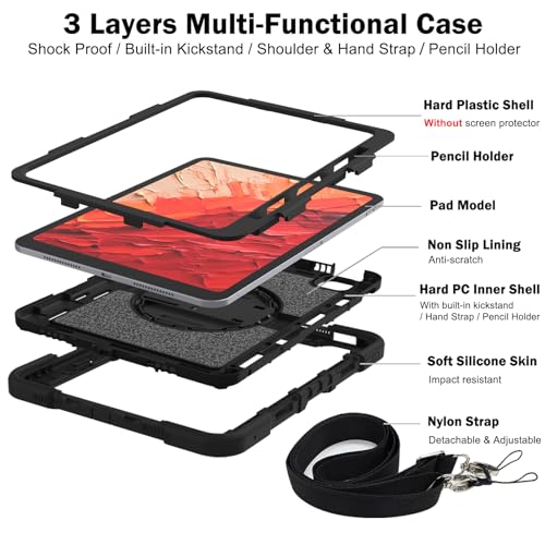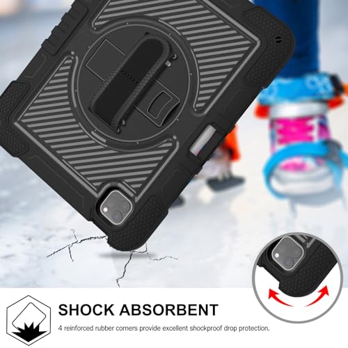 ERDARARIPRO - جراب تابلت كرتوني لطيف مضادة للصدمات مع حامل دوار 360 درجة، حزام يد وحامل قلم لجهاز ابل اي باد برو 11 (2024) 11 بوصة، أسود بالكامل