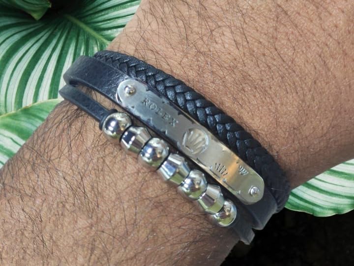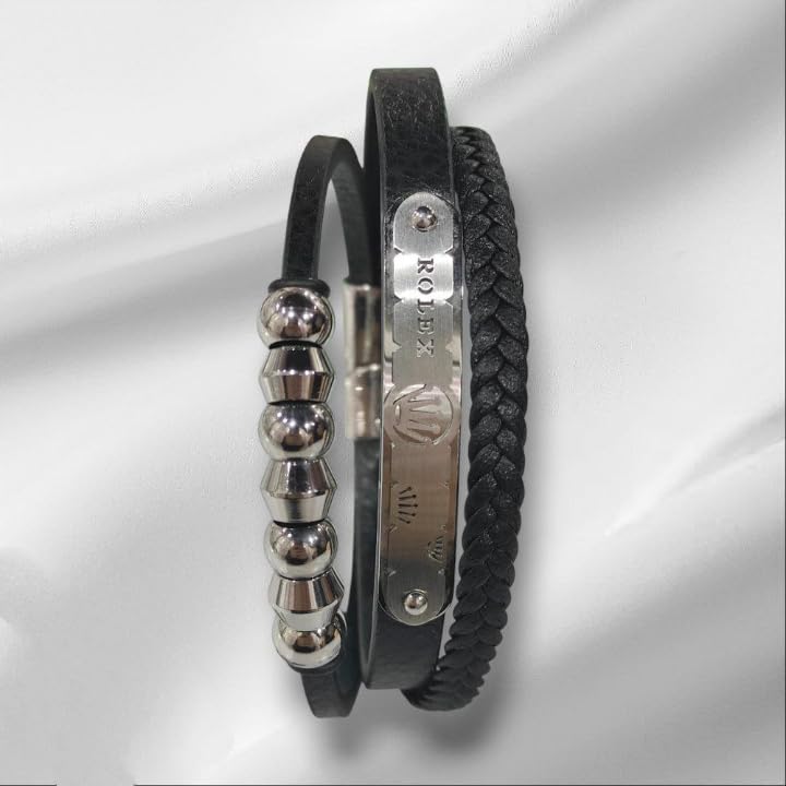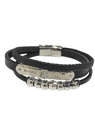 Generic - سوار انيق للرجال مصنوع الجلد بلون اسود مزين بحجر طبيعي علي شكل خرز يحتوي مشبك ممغنط ومصنوع الستانلس ستيل