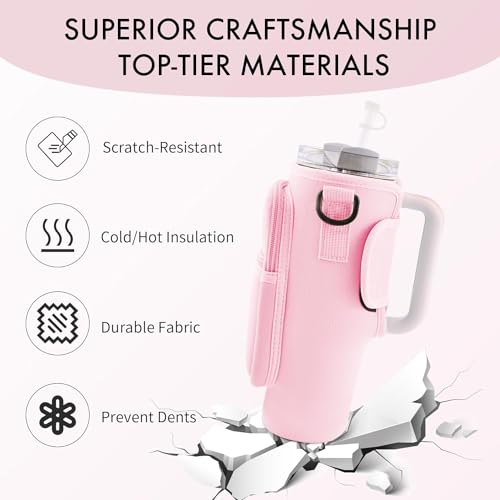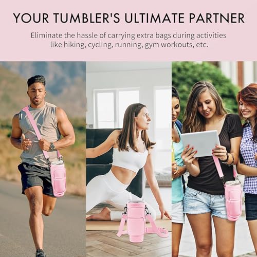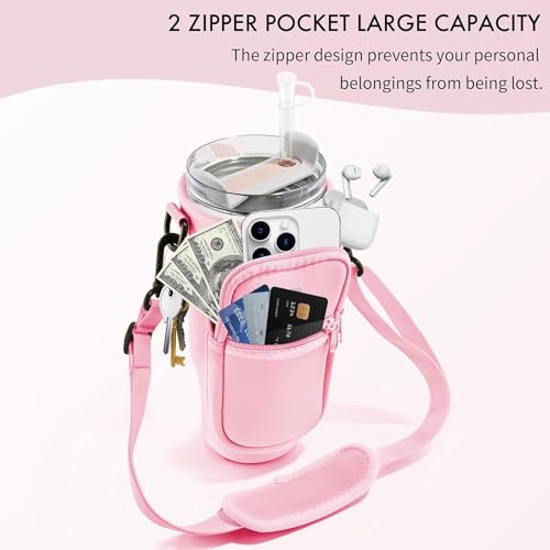 fashion mania - شنطة حمل زجاجة المياه مع جيب للموبايل لكوب ستانلي بسعة 1.1 لتر، حامل زجاجة مياه مع حزام قابل للتعديل وغطاء شفاطة، ملحقات كوب ستانلي (بينك)