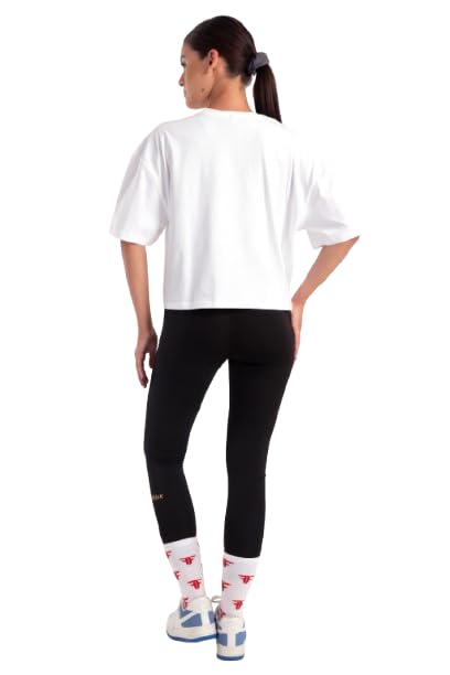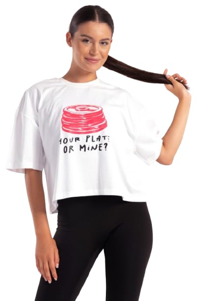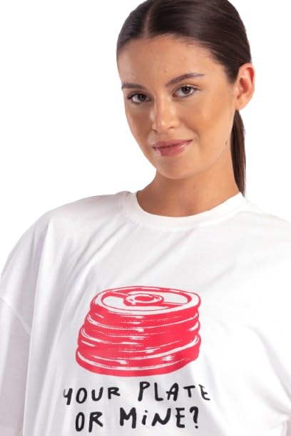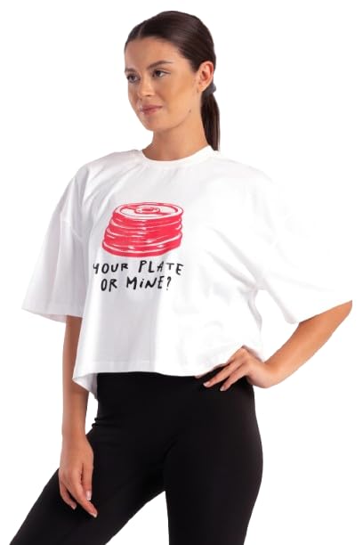 Fit Freak - تيشيرت قصير للنساء بقصة واسعة مطبوع عليه عبارة Your Plate Or Mine بلون أبيض ومقاس سمول S إلى ميديوم M من فت فريك