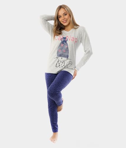 Focas - بيجامة من القطن للنساء مزينة بطباعة قطة وعبارة «cat nap» من فوكاس، لون رمادي فاتح، موديل pj30204